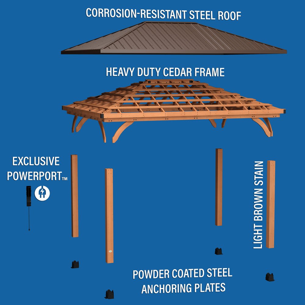 • POWERED UP: Exclusive removable PowerPort™ features 3 electrical outlets and 3 USB ports that is transferable to any post on the structure. PowerPort™ can be used for charging devices, lights and more. PowerPort™ requires power source to be functional (not included)