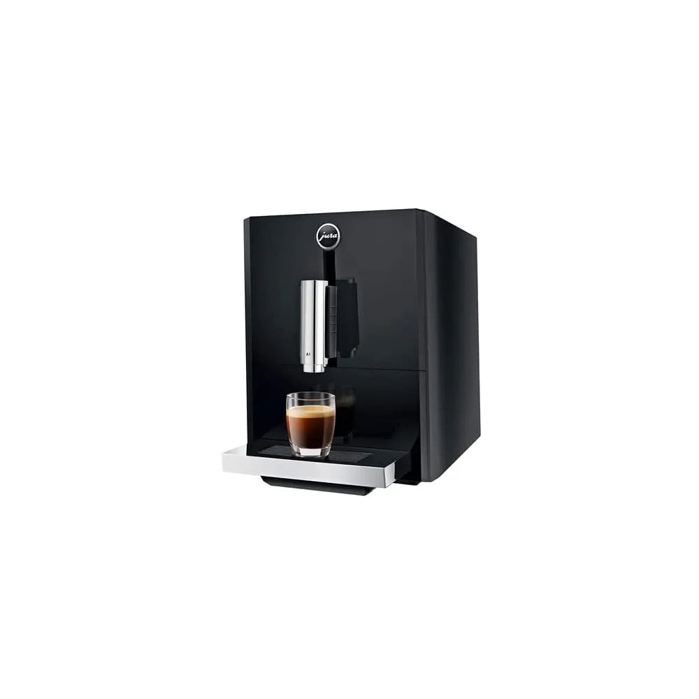 Wake up with a hot cup of espresso made with the Jura A1 Espresso Machine. This beautiful, quality coffee, espresso, and ristretto maker comes in a Piano Black color and is designed with sleek clean lines. The top side has a visible bean container and an intuitive symbol control panel to make your morning shot of espresso simple to make. You’ll get a consistently delicious drink with the thermoblock heating system with 15 bar pump, and you can choose between two levels of coffee strength. This machine comes with an Aroma grinder and CLEARYL Blue filter for the high quality cup of coffee that you expect from Jura. An auto shut off program is included in the machine for your safety. Whether you crave a shot of ristretto or a cup of coffee, the coffee spout adjusts to your needs from 2. 3 to 5. 5 inches. For your convenience, the A1 has a self cleaning option that will remind you after 180 preparations or 80 switch-on rinses when it needs to run so you don’t have to worry. 17-1/2″ L x 9-1/2″ W x 12-3/4″ H, with a 37 ounce water capacity; 4. 4 ounce bean container; 9 serving ground container